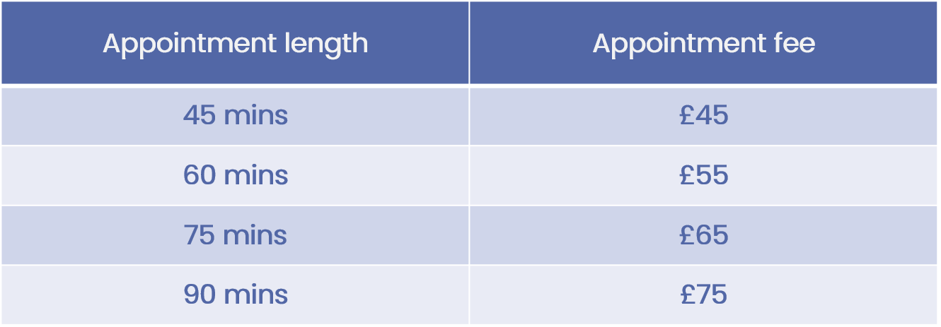 Cancellation fees: 48hrs notice • £30. 24hrs notice • £45.